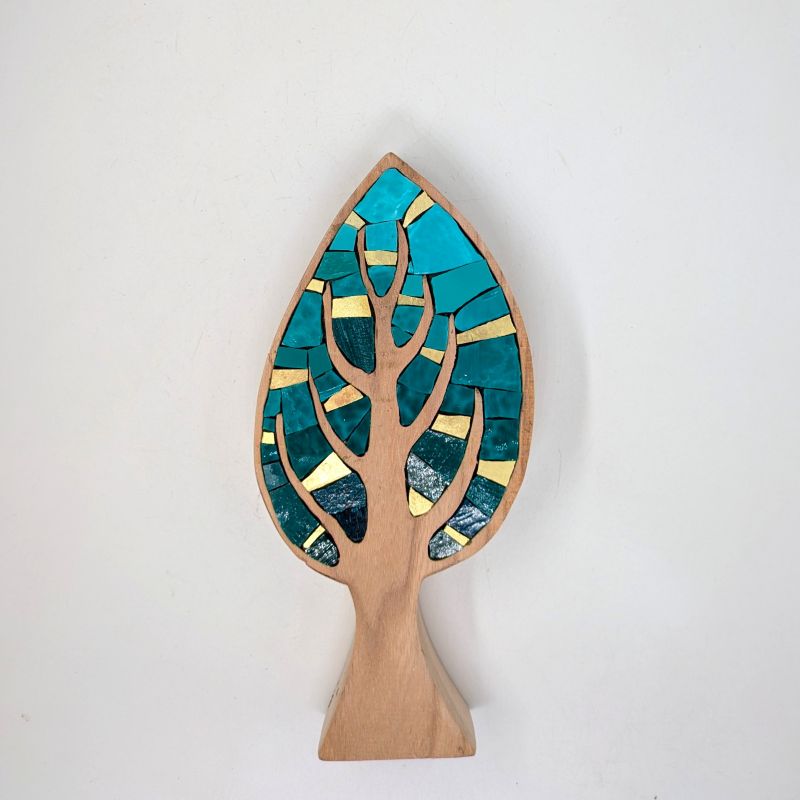 Gli alberi in mosaico sono pezzi unici e numerati, di creazione tutta artigianale. Intagliamo il legno a forma di alberi realistici o inventati e realizziamo poi la creazione musiva, con materiali naturali o con il colore acceso di ori, smalti veneziani e millefiori. Ogni albero ha un piedistallo removibile che gli permette di essere appoggiato come soprammobile, ma può anche essere appeso a muro.