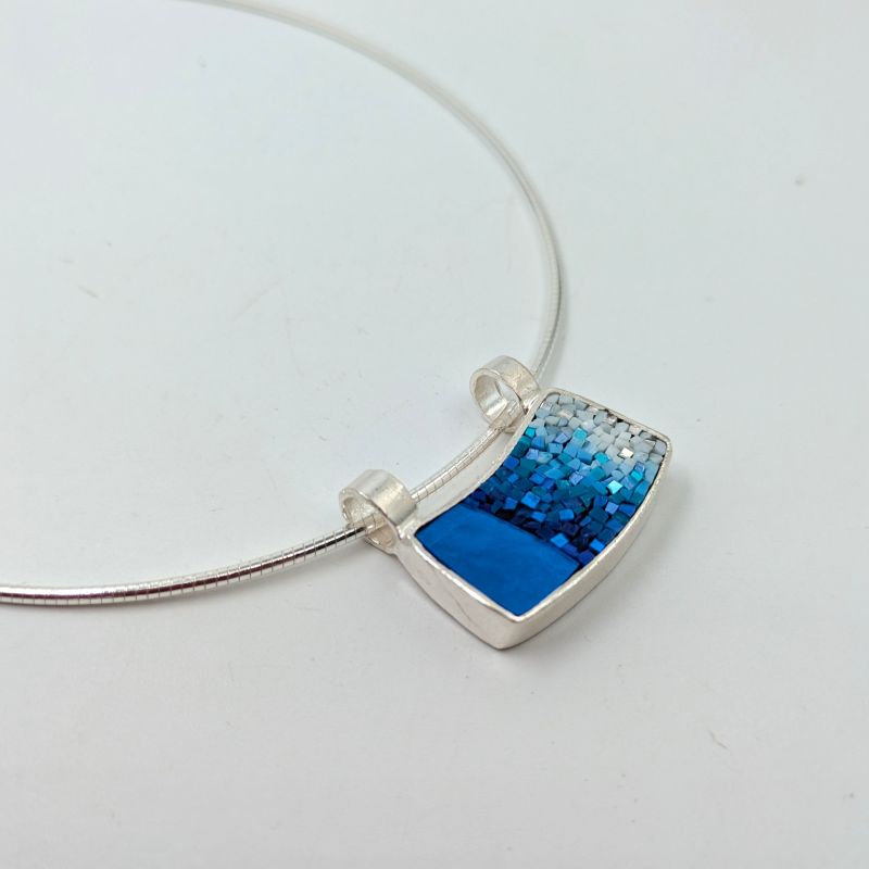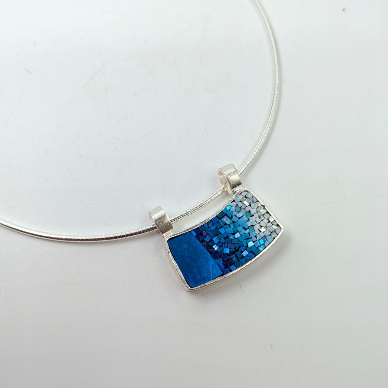 Dieser Landscapes- Anhänger ist ein einzigartiges Stück, das sowohl in Bezug auf die Silberform als auch auf das Mosaik vollständig handgefertigt ist.