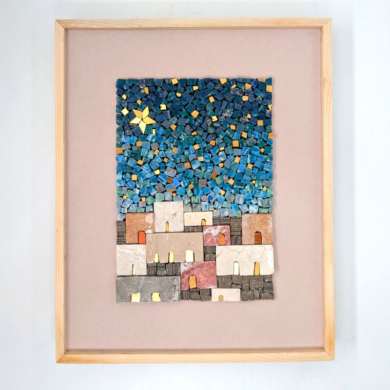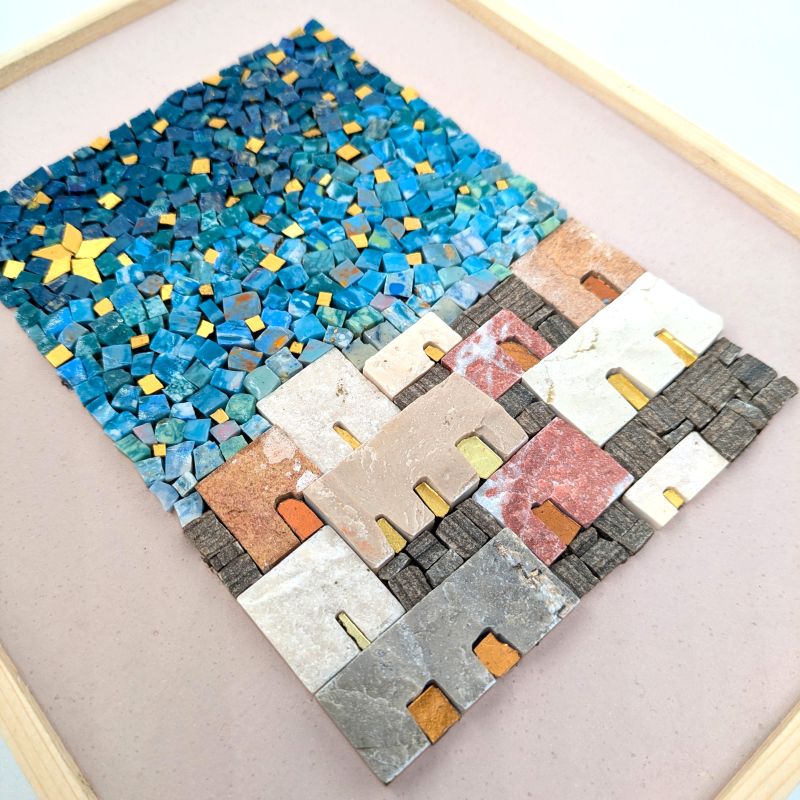 Es handelt sich um ein handgefertigtes Kunstobjekt und seine Unregelmäßigkeit garantiert die Authentizität und Einzigartigkeit des Produkts. Am besten gehen Sie vorsichtig damit um und berühren es, da die Kanten der Fliesen, insbesondere bei Glasfliesen und bei moderneren Verfahren, scharf sein können.