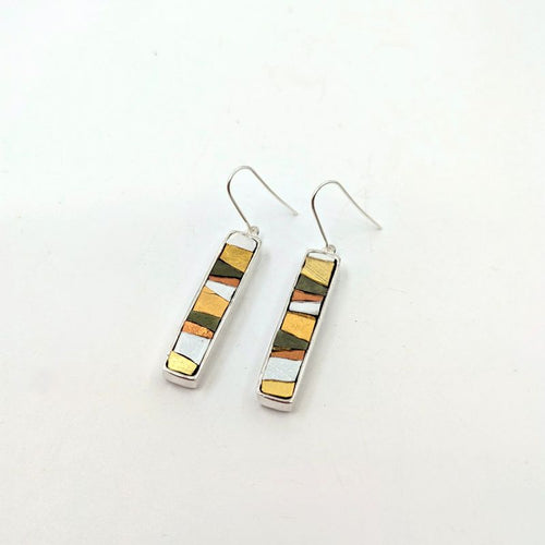 Bei der Mosaikherstellung verwenden wir hauptsächlich Mosaikgold, ein echtes Blattgold zwischen zwei Glasschichten, das auch eingefärbt werden kann. Die Tesserae-Ohrringe hingegen sind eine Stilkonzentration, die das Grundelement des Mosaiks, die Tessera, hervorhebt und sie zum Protagonisten macht.