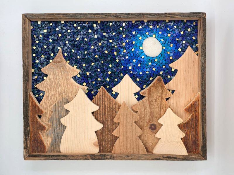 Mosaik aus venezianischen Emaillen und Gold, goldenen Steinen, Formen aus recyceltem Holz.